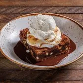 our housemade chocolate chip brownie with graham cracker crust, chocolate sauce, toasted marshmallow + a scoop of vanilla bean ice cream [1510 cal]