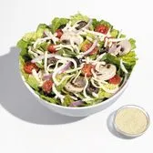 This fresh and vibrant salad that's packed with flavor! Crisp romaine lettuce is topped with juicy tomatoes, mushrooms, black olives, shredded mozzarella, and oregano, all tossed in a creamy, Green Goddess (creamy ranch, pesto) dressing.