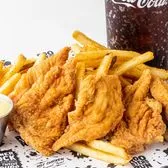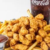 - A large order of hand cut and hand breaded to order tender bites. Served with seasoned fries, choice of signature sauce, and choice of drink.