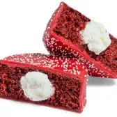 Red velvet cake filled with cream cheese frosting and coated in sweet white chocolate.