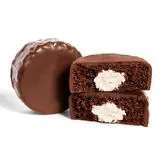 A chocolate cake with rich vanilla buttercream center, covered with chocolaty glaze.