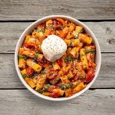 Pasta, housemade tomato sauce, roasted cherry tomatoes, burrata cheese, basil pesto, grated parmesan