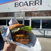 8 oz Short Rib Beef Patty, Pepper Jack and American Cheese, Onions, Pickles, Tomatoes, Hydroponic Lettuce, Haus Burger Sauce, on a Fresh Brioche Bun.