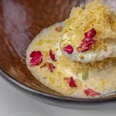 sweet paneer patties, Pheni (vermicelli noodles), honey, pistachios, rosewater, rose petals