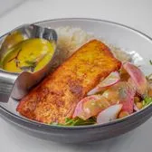 with Goan yellow curry sauce, served with basmati rice and a small arugula salad with cucumber, garbanzo beans, radish, and beetroot