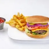 Grilled beef patty served with tomato, pickles, onion, lettuce. Cheese and bacon may be added for an additional charge. Served with a choice of rice, salad or fries.