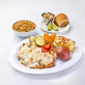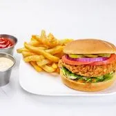 Chicken breast breaded in all-purpose flour and fried. Served with tomato, pickles, onion and lettuce and a choice of either rice, salad or fries. May add cheese and bacon for an additional charge. May be ordered grilled.