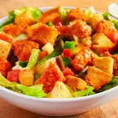 Buffalo chicken, lettuce, tomatoes, cheese, cukes, red onions, green peppers, carrots, and croutons. 810 cal/svg 1 svg