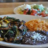 Grilled portobello mushrooms, onions, tomatoes, serranos, yellow bell peppers, spinach, corn & zucchini. Served with rice & refried black beans and lettuce, guacamole, sour cream, pico & jack cheese and a choice of tortillas