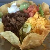Traditional shell with mixed greens, choice of taco beef or shredded chicken, tomatoes, cheese, sour cream & guacamole
