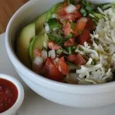 A lighter version of our top-seller: A layered salad with rice, choice of greens, black beans, pico, avocado slices & jack cheese. Served with a side of salsa for dressing