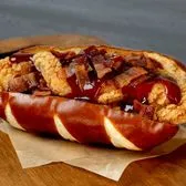Crispy chicken strips made with all-natural chicken with hickory-smoked bacon & tangy BBQ sauce in a soft pretzel roll.