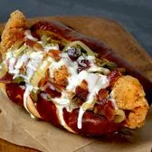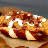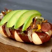 Grilled all-beef hot dog topped with hickory-smoked bacon, sautéed jalapeños, serrano peppers & onions, mayo, yellow mustard & avocado in a soft pretzel roll.
