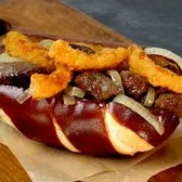 Grilled all-beef hot dog topped with onion, relish & yellow mustard in a soft pretzel roll.