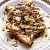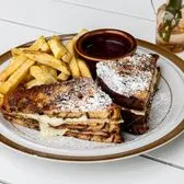 Ham, turkey, Swiss cheese, cinnamon raisin bread French toast, maple powdered sugar, side seasonal compote Served with fries