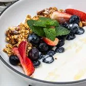 Bulgarian yogurt, toasted coconut, granola, fresh fruit, local honey, and mint. [V]