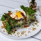 Sliced sourdough, lime, sprouts, cilantro, Texas chili crisp | Add Egg