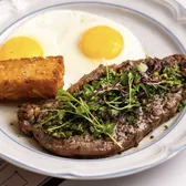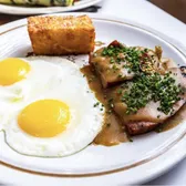 Black Forest ham steak, pickled mustard seed, red-eye gravy, two eggs and chives. Served with homemade hash browns.