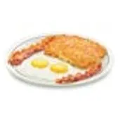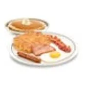 One egg* your way, 1 bacon strip, 1 pork sausage link, 1 thick-cut piece of ham, hash browns & 1 buttermilk pancake.