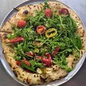 12" pie with fresh mozzarella, goat cheese, pickled sweety drop & banana peppers, arugula, pecorino, gaeta olives, e.v.o.o., sea salt, basil