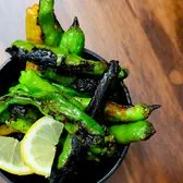 Grilled Shishito Peppers tossed in yuzu, soy and Japanese seven spice.