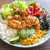 A fresh burrito bowl with jasmine rice and black beans, topped with corn, bell peppers, red onions, mixed greens, cherry tomatoes, cotija cheese, and sliced avocado. Finished with microgreens, tortilla strips, and a squeeze of lime. (Pictured Burrito Bowl with Chicken)