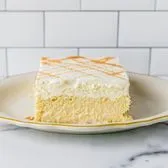 Tres leches in its purest form. Vanilla sponge cake soaked with condensed milk, evaporated milk, and heavy cream, topped with a whipped vanilla icing