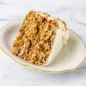 Three layers of moist carrot cake with a rich, cream cheese buttercream icing and toasted coconut on the sides.