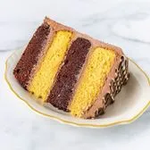 Four alternating layers of chocolate and vanilla cake with chocolate buttercream icing & a chocolate drizzle on top.