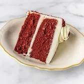 Two layers of a classic red velvet cake with rich, cream cheese buttercream icing