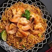 Wok-tossed noodles with chili butter and prawns