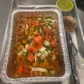 Samosa topped with chickpeas curry & garnished with tomato & onions. Served with green & brown chutney.