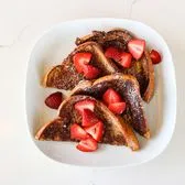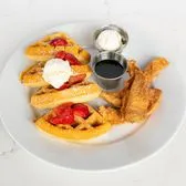 challah french toast topped with strawberries & dusted with powdered sugar; served with pure maple syrup