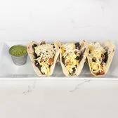 three flour tortillas with black bean spread, scrambled eggs, cheese & choice of potato, sausageor smoked applewood bacon; with green tomatillo sauce & side choice of potatoes o’brien or fresh fruit