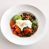 fresh avocado, sweet potatoes, kale, black beans & tomatoes topped with a fried egg