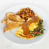 three-egg omelet with arugula, mushroom, onion, tomato, mozzarella & cheddar cheese; topped with spicy ranchero sauce & served with organic sprouted wheat toast