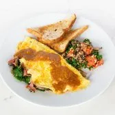 three-egg cheese omelet with three toppings: bacon, prosciutto, roasted chicken, baby shrimp, avocado, jalapeños, black beans, arugula, onion, corn, mushrooms or kale; finished with spicy ranchero sauce