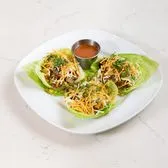 three baby iceberg lettuce wraps filled with yellow & red bell peppers, organic quinoa, onion, celery, mushrooms, zucchini, corn, garlic, cilantro & sesame oil; topped with queso fresco, crispy quinoa strips & served with savory ginger sauce