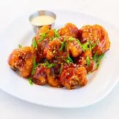 crispy cauliflower florets seasoned in gluten-free tempura batter, tossed in house-made honey garlic spicy sticky sauce; garnished with snow peas & sesame seeds & served with our mango ranch dressing