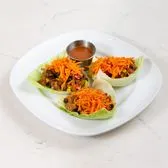 three baby iceberg lettuce wraps filled with all-natural ground turkey, black beans, corn, yellow & red peppers, shredded carrots; sautéed in a spicy soy glaze & served with savory ginger sauce.