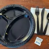 Each set contains 1 heavy- duty plastic plate and 1 heavy - duty cutlery pack containing a fork, knife, spoon, salt and pepper packets and a paper napkin.