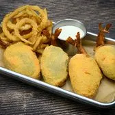 Jumbo jalapeños stuffed with shrimp and Jack cheese. Fried to a golden brown. Served with ranch dressing.