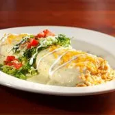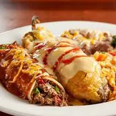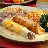 A fresh roasted pepper stuffed with blended cheeses or slow-roasted shredded beef and your choice of hand-rolled enchilada. Served with refried beans and your choice of Papas con Chile™ or Mexican rice.