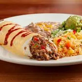 Your choice of seasoned ground beef with chile con carne sauce or hand-shredded slow-roasted chicken with sour cream sauce, Mexican rice, cheese and refried beans wrapped in a homemade flour tortilla. This item is a meal in itself and does not include sides.