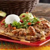 A crisp handmade flour tortilla topped with refried beans, seasoned ground beef, chile con queso, chile con carne sauce, shredded cheddar and Monterrey Jack cheese, lettuce, tomato, sour cream and our fresh homemade guacamole. This item is a meal in itself and does not include sides.