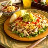 Fresh salad mix topped with your choice of ground beef or shredded roasted chicken, creamy chile con queso, our famous charro beans, tomatoes, mixed cheeses and guacamole, with a cup of Tortilla Soup. This item is a meal in itself and does not include sides.