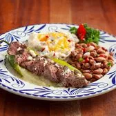 Sliced sirloin steak*, Anaheim pepper, cheese, Papas con Chile, charro beans.