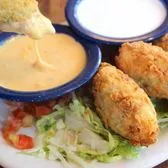 A trio of our Fried Jalapeños (3), beef fajita Panchos (3), and a small Queso. Served with a side of ranch.