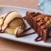 Warm, rich, fudge-filled chocolate cake is drizzled with hot fudge. Served with vanilla ice cream.