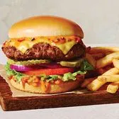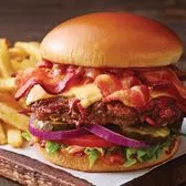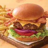 Our juicy all-beef patty topped with two slices of American Cheese and two strips of Applewood-smoked bacon. Served with lettuce, tomato, onion and pickles on a Brioche bun. Served with classic fries.